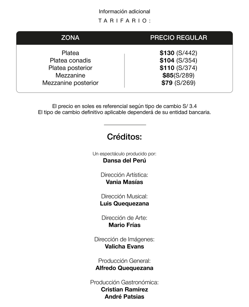 La entradas Conadis estarán ubicadas dentro de la zona platea. Los acompañantes deberán contar con su propia entrada. Para adquirir la entrada CONADIS, comunicarse al 01-219 9000 o al WhatsApp 934 268 558.